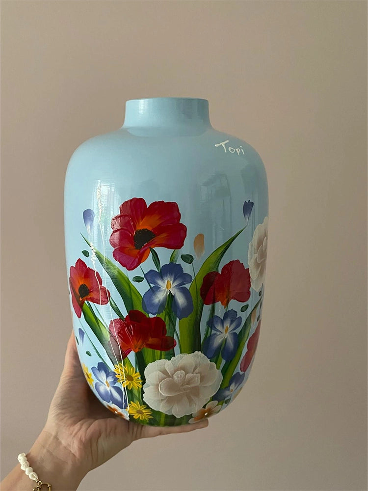 Een unieke oer-Hollandse vaas met bloemen thema op een lichtblauwe ondergrond.