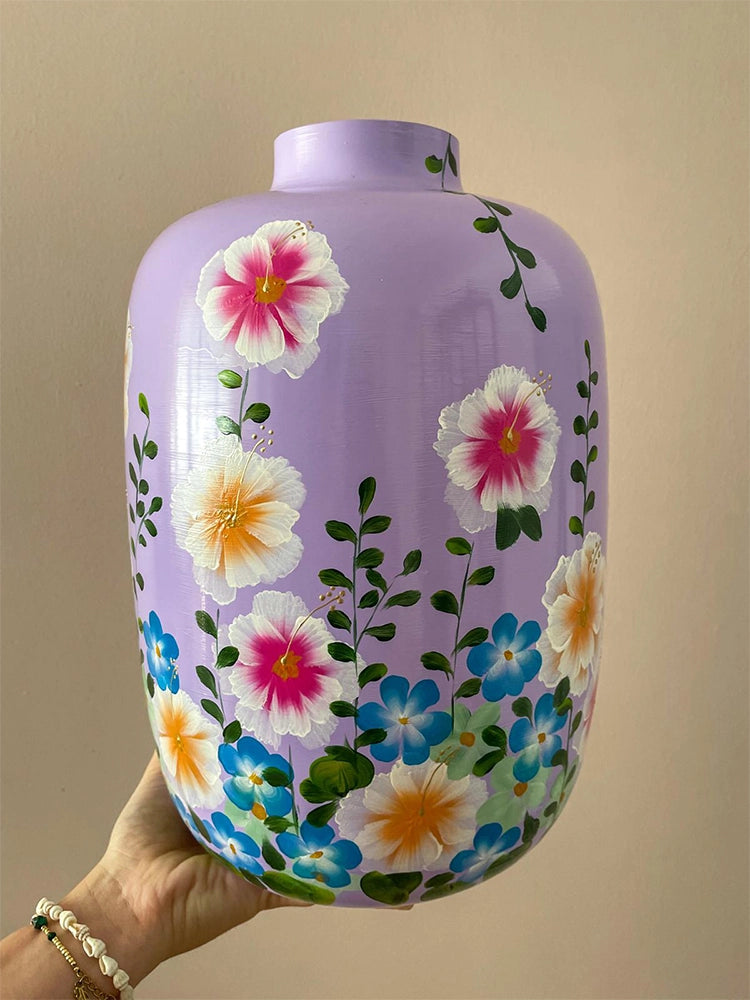 Een unieke handbeschilderde vaas met bloemen thema op een lila ondergrond.