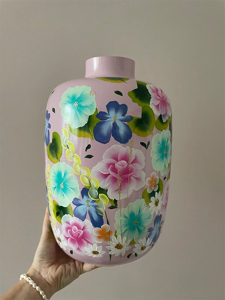 Een prachtige uniek gekleurde vaas met bloemen thema op een lichtroze ondergrond.